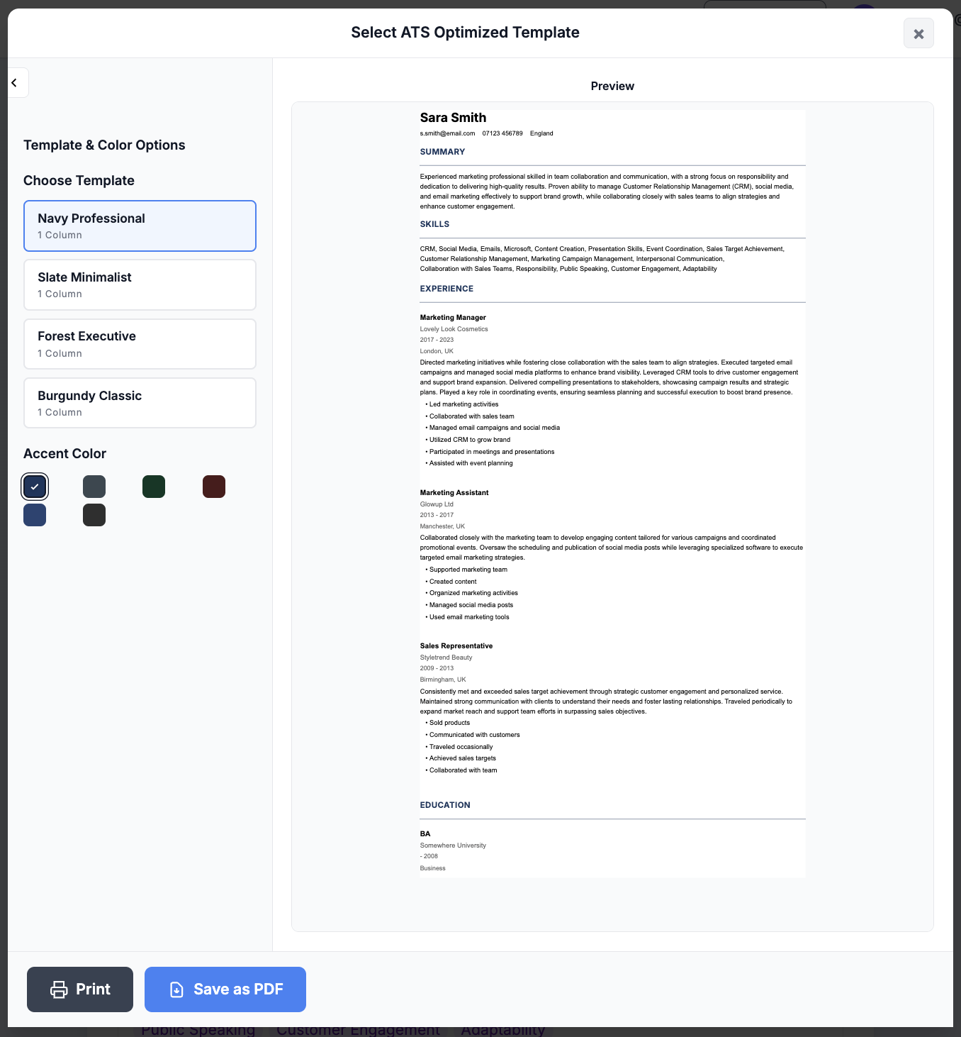 You can choose from four professional, ATS friendly templates. Each with a different color accent and font.